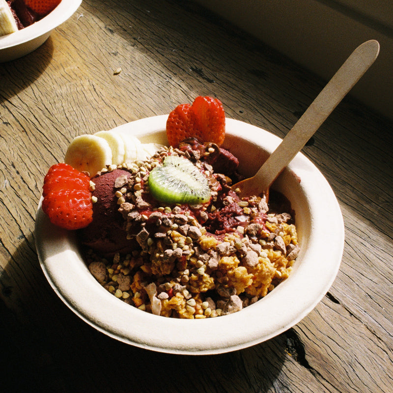 Our 500ml sugarcane bowls with no lid are made of sugarcane pulp, feature a wide rim, and are suitable for various fast food menu items. Tight-knit fibres make these bowls suitable for hot foods such as ramen, soups, and curries, and they are certified for home and commercial compost. Part of our sugarcane range, these bowls were designed to help tackle the vast amounts of plastic packaging used in takeaway food deliveries, minimising the environmental impact of convenience culture.